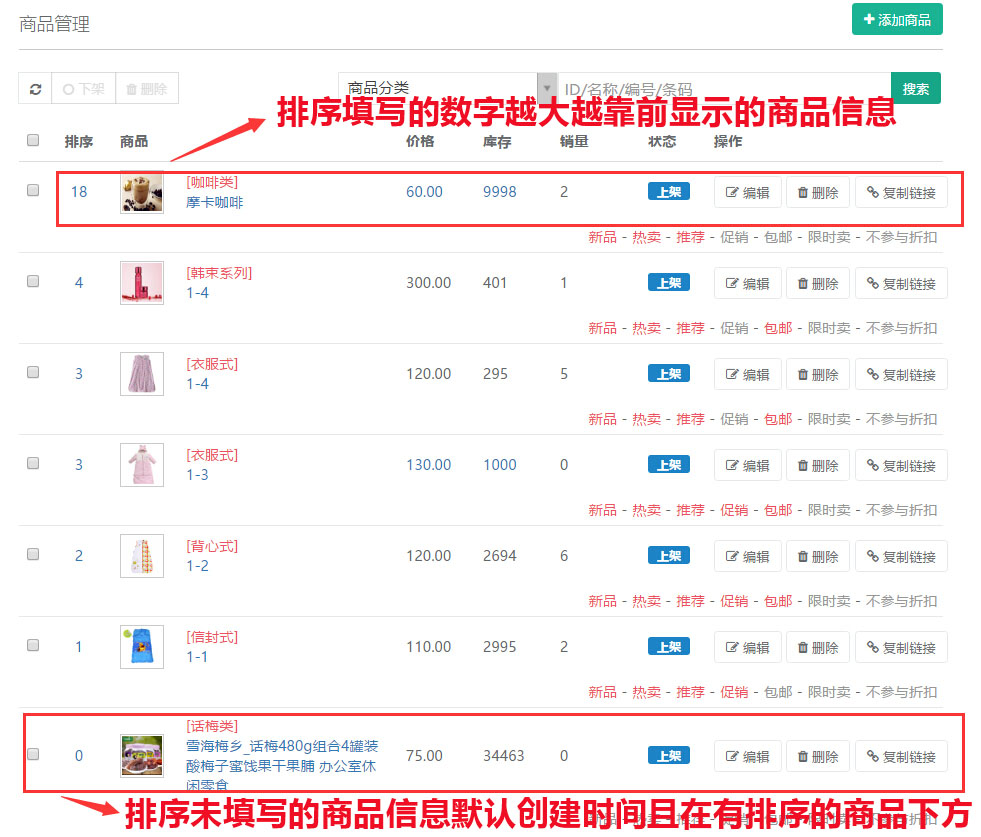 商品的排序是按照“基本”中填写的数字信息进行排序的,数字越大信息越靠前显示,如不填写则默认为创建添加的商品日期,添加的商品越晚则信息会越靠前显示,添加的商品会在已填写数字排序的最下方显示,参见下图: