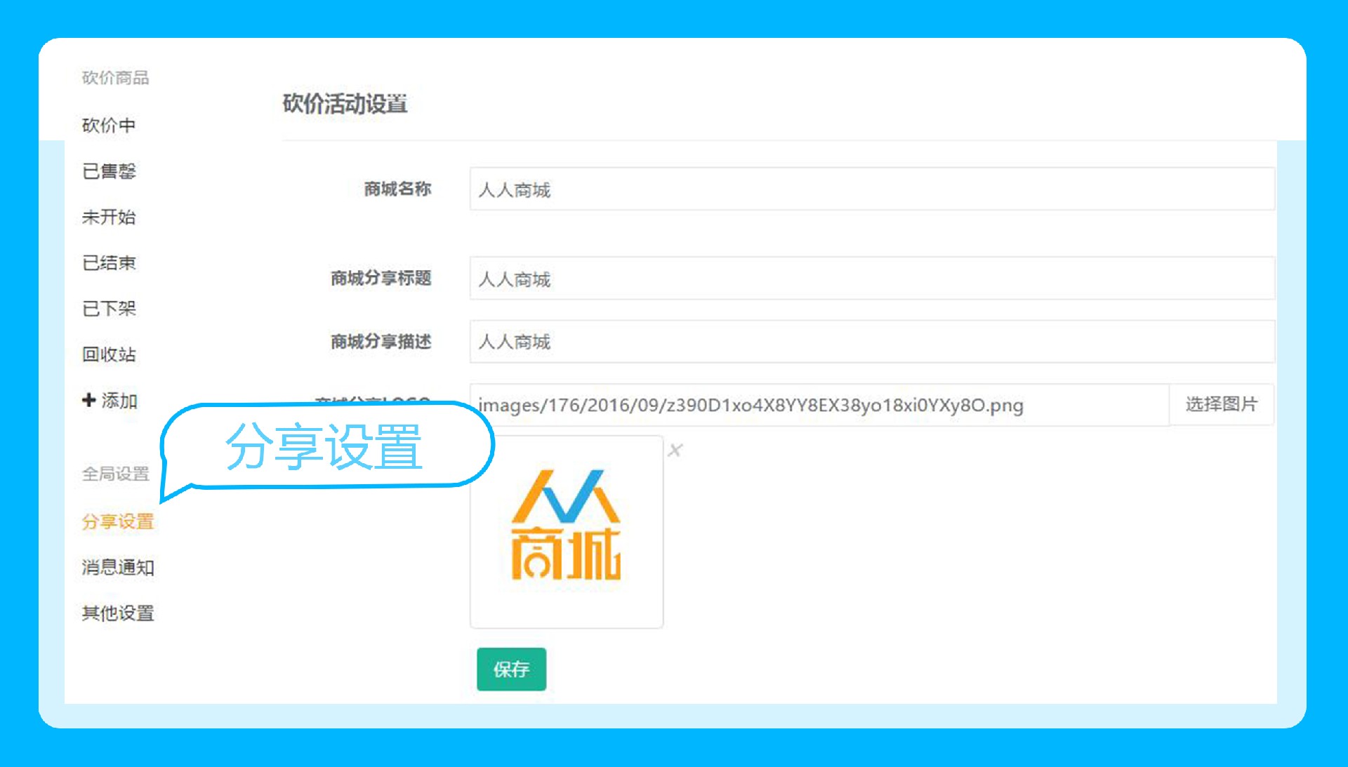 人人商城的砍价活动分享设置,填写商城的名称、分享的标题、分享的描述信息、分享的LOGO信息,在将参与砍价活动的商品分享出去时直接显示,参见下图: